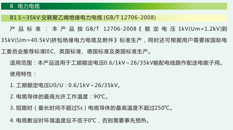 一、產品標準    本產品按GB/T 12706-2008《額定電壓1kvUm=1.2kv)到35kvUm=40.5kv》)擠包絕緣電力電纜及附件》標準生產,同時還可根據用戶需要按國際電工委員會推薦標準IEC、英國標準、德國標準及美國標準生產。