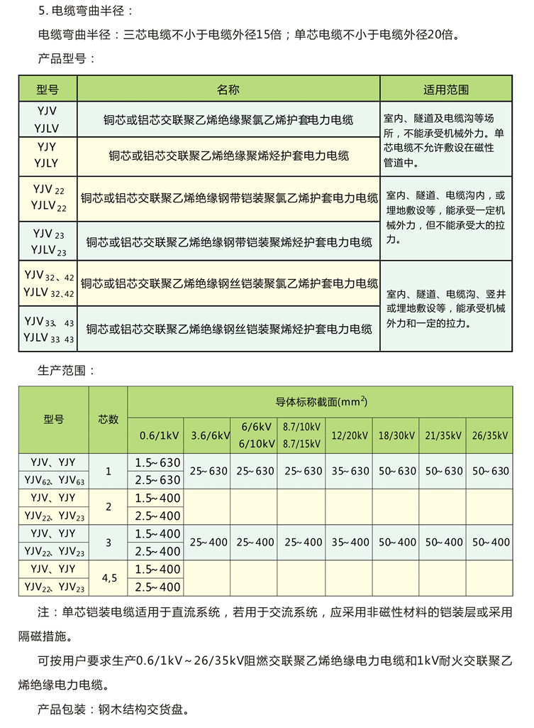 二、使用范圍    本產品適用于配電網、工業裝置等領域,用于固定敷設在交流50HZ、額定電壓0.6/1kv的電力輸配電線路上,主要功能是輸送電能。本產品為通常條件下使用的產品,不適用一些特殊條件的場合,如架空、水下、船底、海底、核電站等。