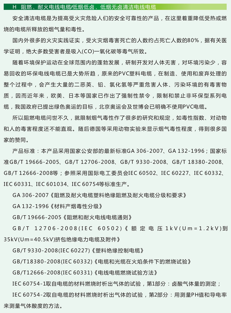 一、產品標準 本產品采用國家公安部的最新標準GA 306-2007、GA132-1996;國家標準GB/T 19666-2005、GB/T 12706-2008、GB/T9330-2008、GB/T18380-2008、GB/T 12666-2008等;參照采用國際電工委員會IEC60502、 IEC60227、IEC60332、IEC60331、IEC601034、IEC60754等標準生產。